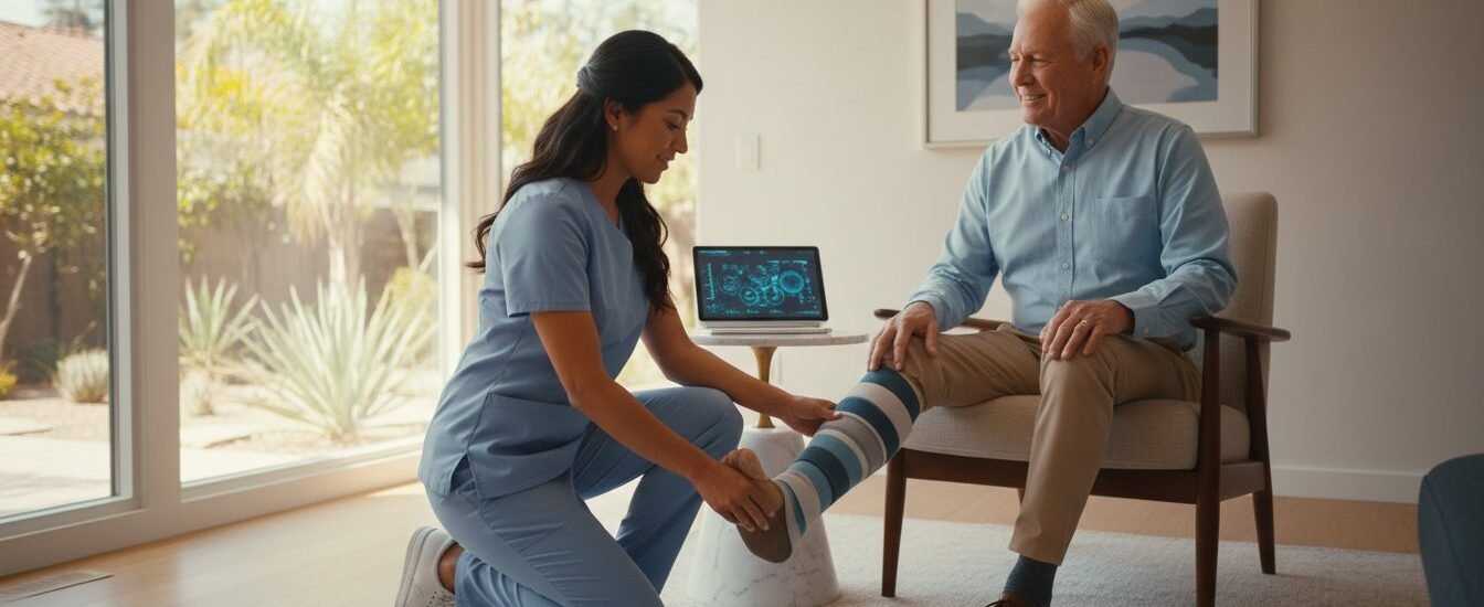 Recovery shouldn’t feel like a logistical burden. We’ve engineered a transition model that moves you from a hospital discharge directly into a high-performance home recovery environment within 24 to 48 hours. Our team manages the complexity of your care across Glendale, Beverly Hills, and the greater Los Angeles area; we handle the administrative heavy lifting by coordinating directly with Medicare Part B and major private insurance providers. This ensures your focus remains on biological optimization rather than paperwork. By bringing compression therapy for leg ulcers Southern California residents trust directly to their doorstep, we eliminate the 45 percent of missed appointments typically caused by transportation barriers in LA traffic.